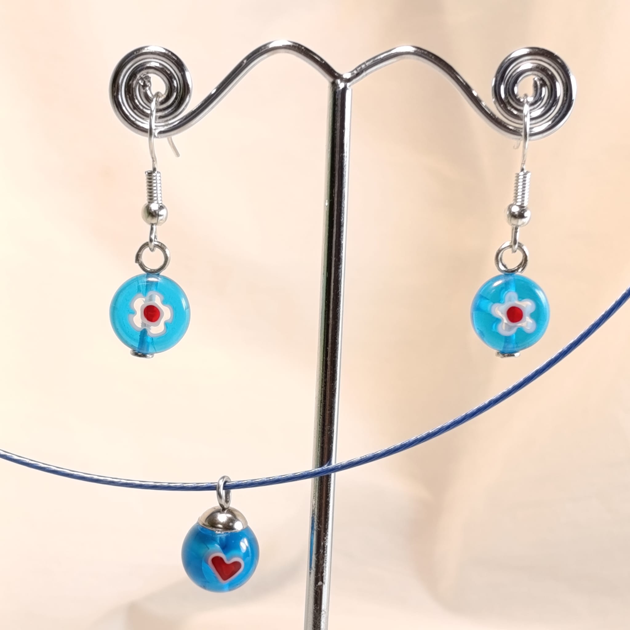 Souprava náušnice a přívěsek se strunou – Benátské sklo Murano – Millefiori. Délka struny 47cm. Materiál sklo a chirurgická ocel.