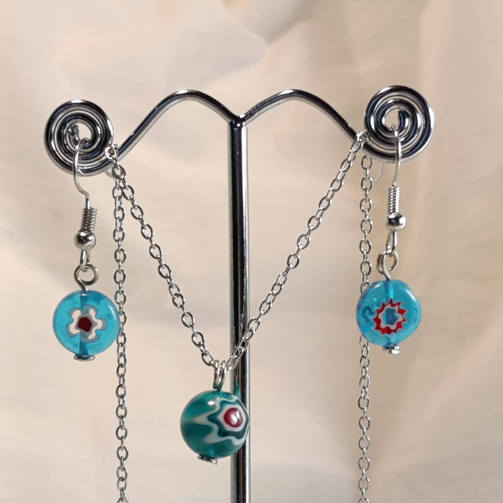 Souprava náušnice a řetízek s přívěskem – Benátské sklo Murano – Millefiori. Délka řetízku 50cm. Materiál sklo a chirurgická ocel.