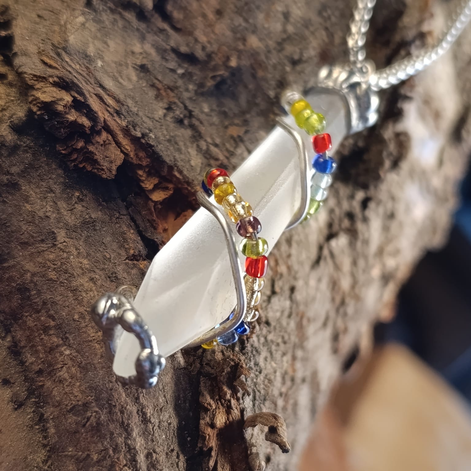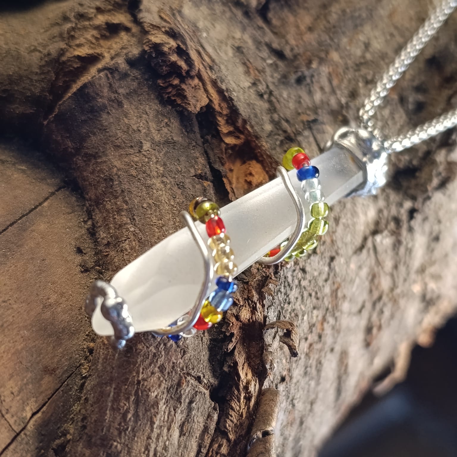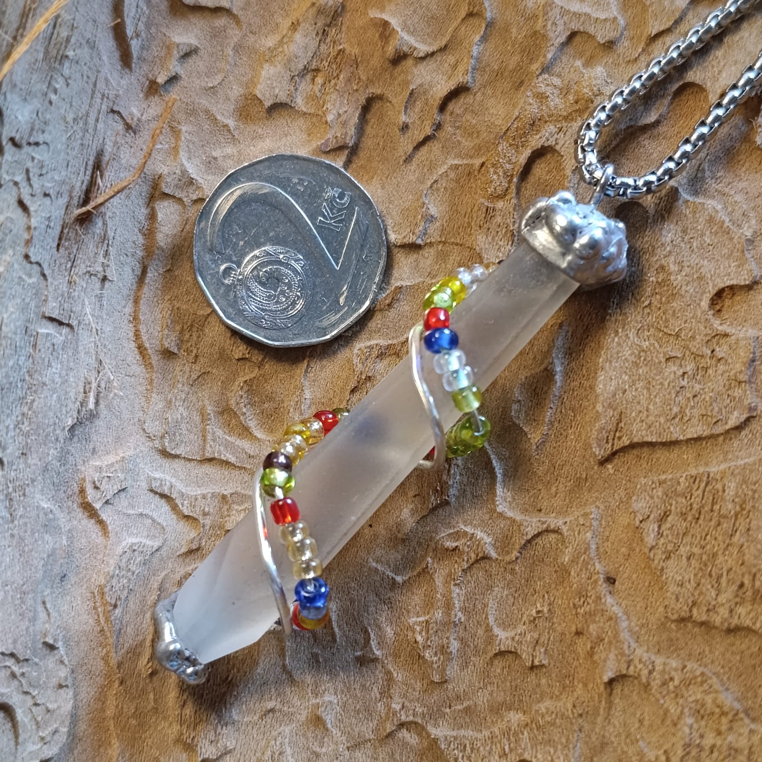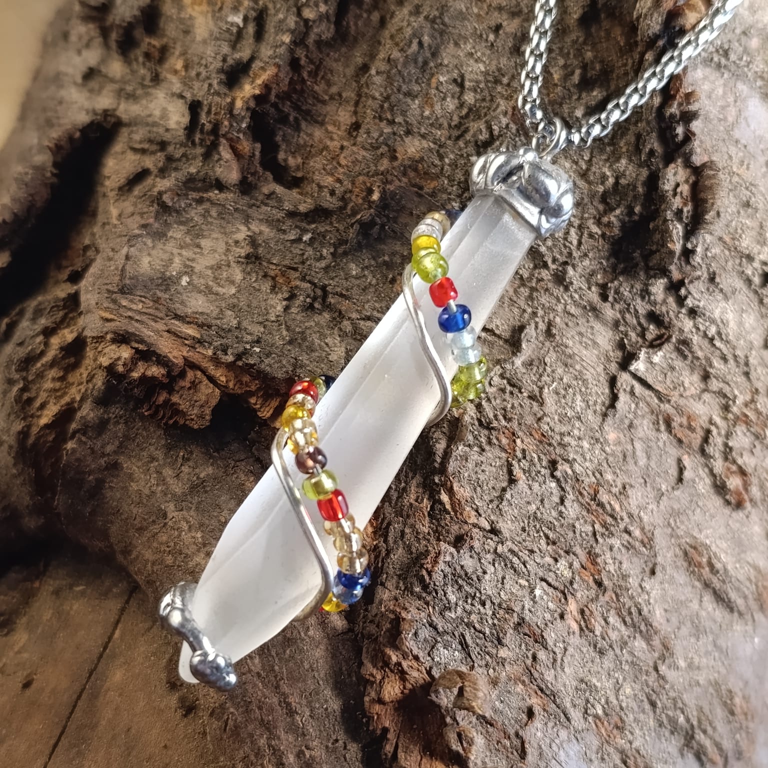 DNA 🧬 talisman z tromlovaného skla, ovinutého postříbřeným drátem a skleněnými korálky.