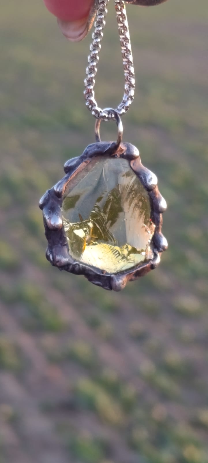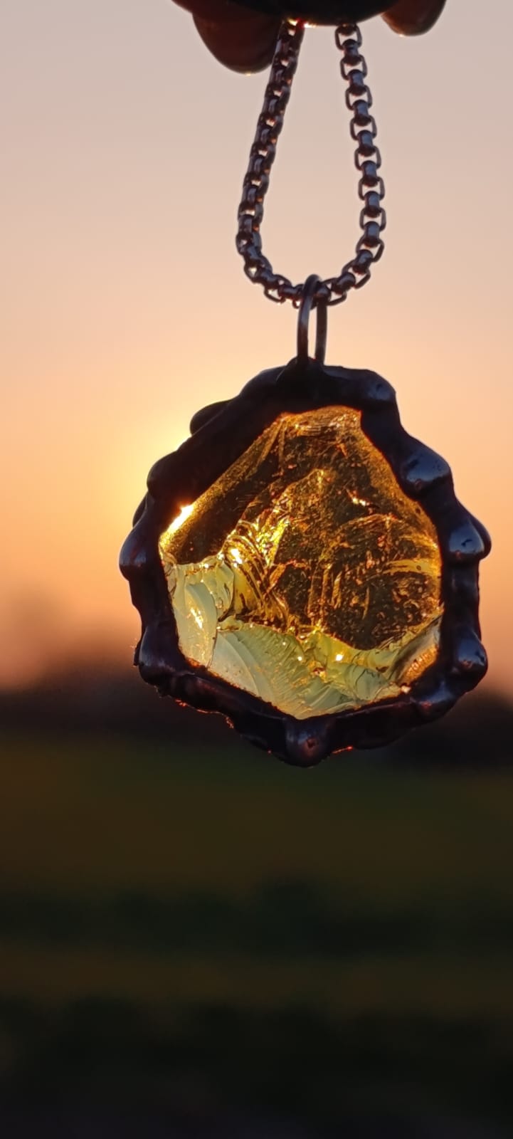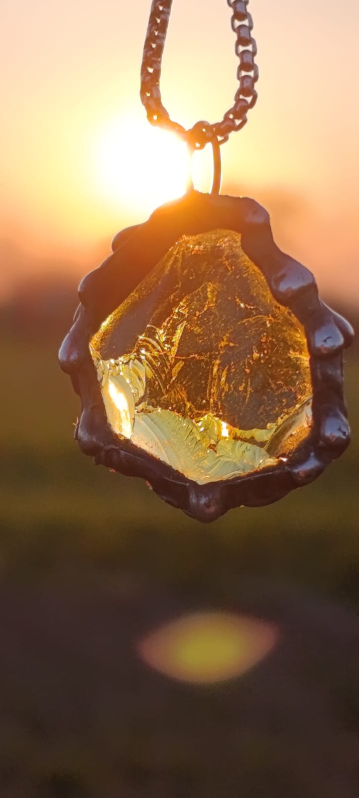 Zavři oči… Tento krasavec tě vezme kam jen budeš chtít. Překrásný skleněný střep v barvě kdy přemýšlíš zdá je víc zelená nebo hnědá, potom se zbarví sluncem jako med a večer sálá temnotou.. Po jeho obvodu stékají kapky cínu, roztavené při poslední aktivaci Portálu…