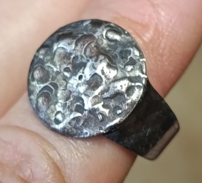 Cínovaný prsten kovářského vzhledu, bez kamene. K tomuto prstenu dostanete krabičku zdarma.
