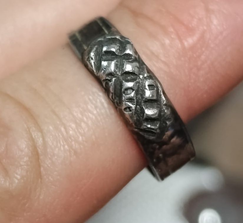 Cínovaný prsten kovářského vzhledu, bez kamene. K tomuto prstenu dostanete krabičku zdarma.