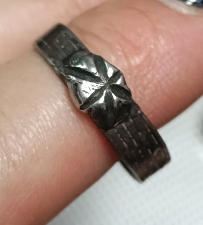 Cínovaný prsten kovářského vzhledu, bez kamene. K tomuto prstenu dostanete krabičku zdarma.
