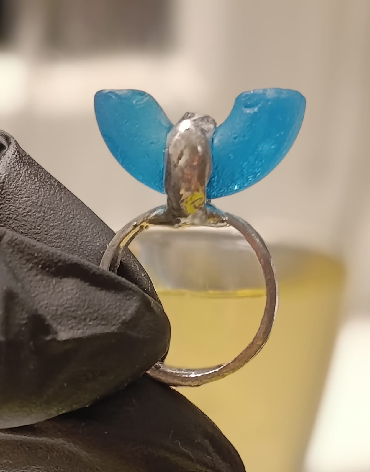 Prsten Orel s vykopávkovým sklem ze staré sklářské huti zaniklé v 50.letech. Jedná se o prsten unikát – tzn jediný neopakovatelný kus. Napodobení by bylo možné pouze pokud bych našla podobný kus skla.