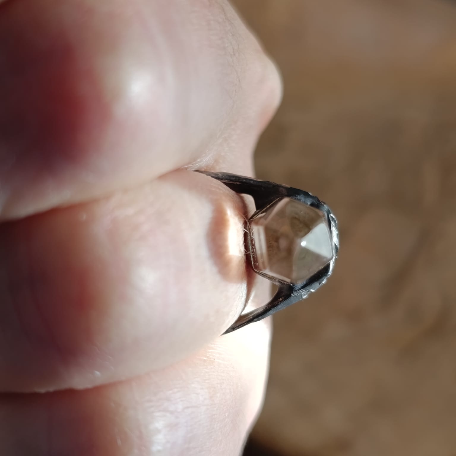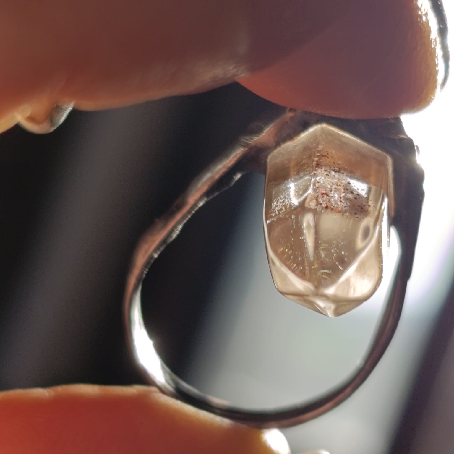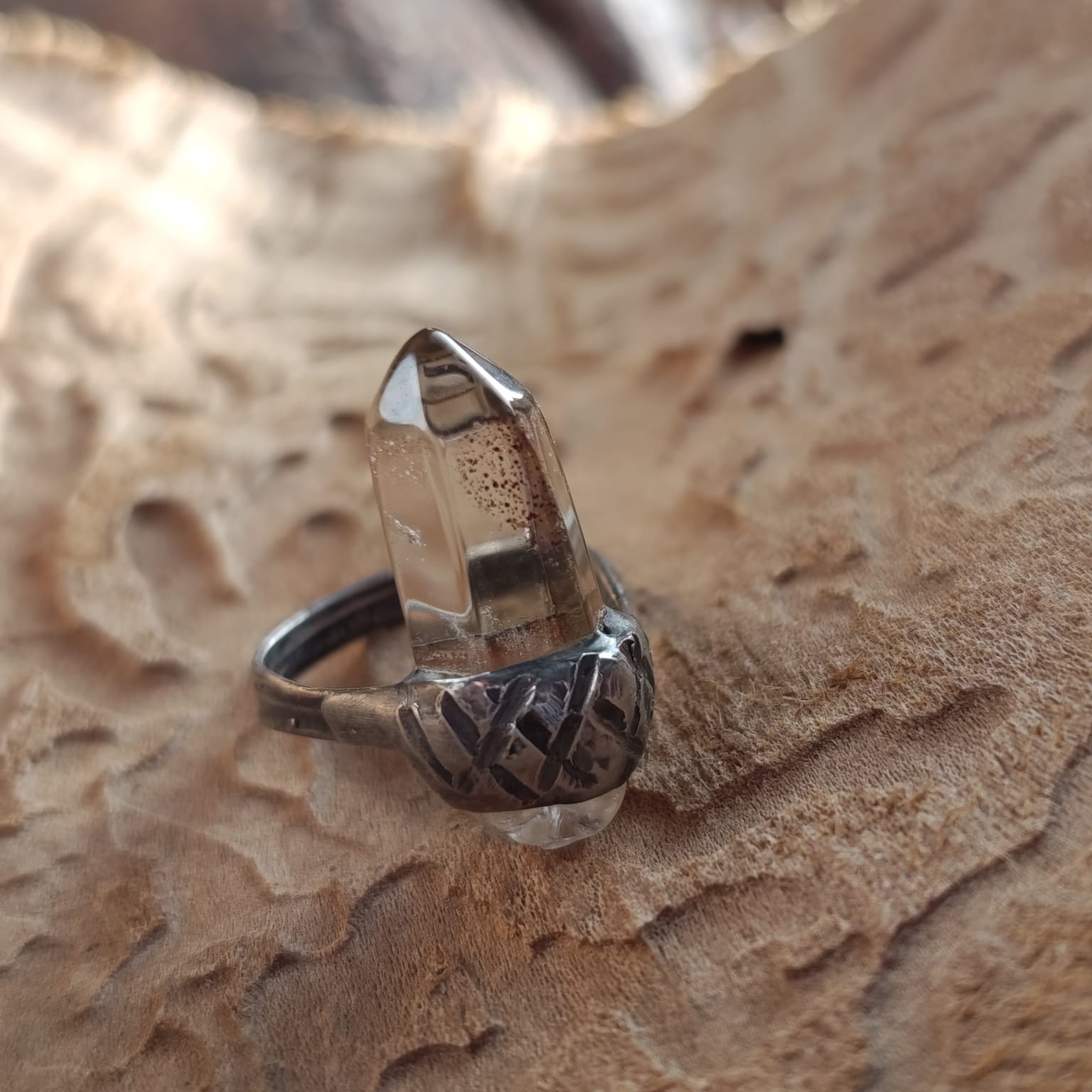 Žalud. Prsten s leštěným krystalem křišťálu. A ten křišťál obsahuje drobné železité inkluze. Proto by se skoro dal nazvat i lodolitem. Každopádně je to prsten pro osobu s citem pro detail, o kterém ví jen ona sama 💚