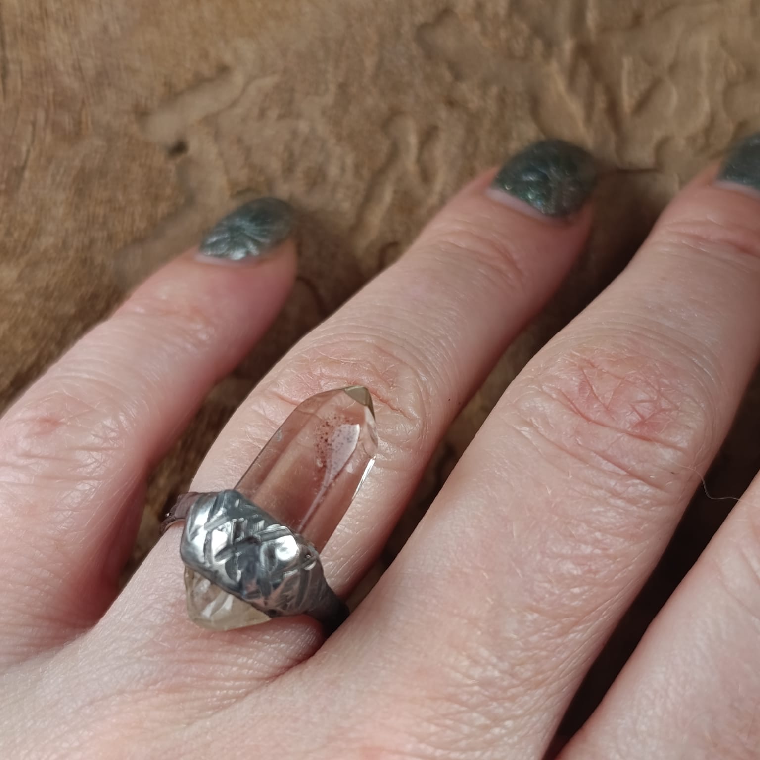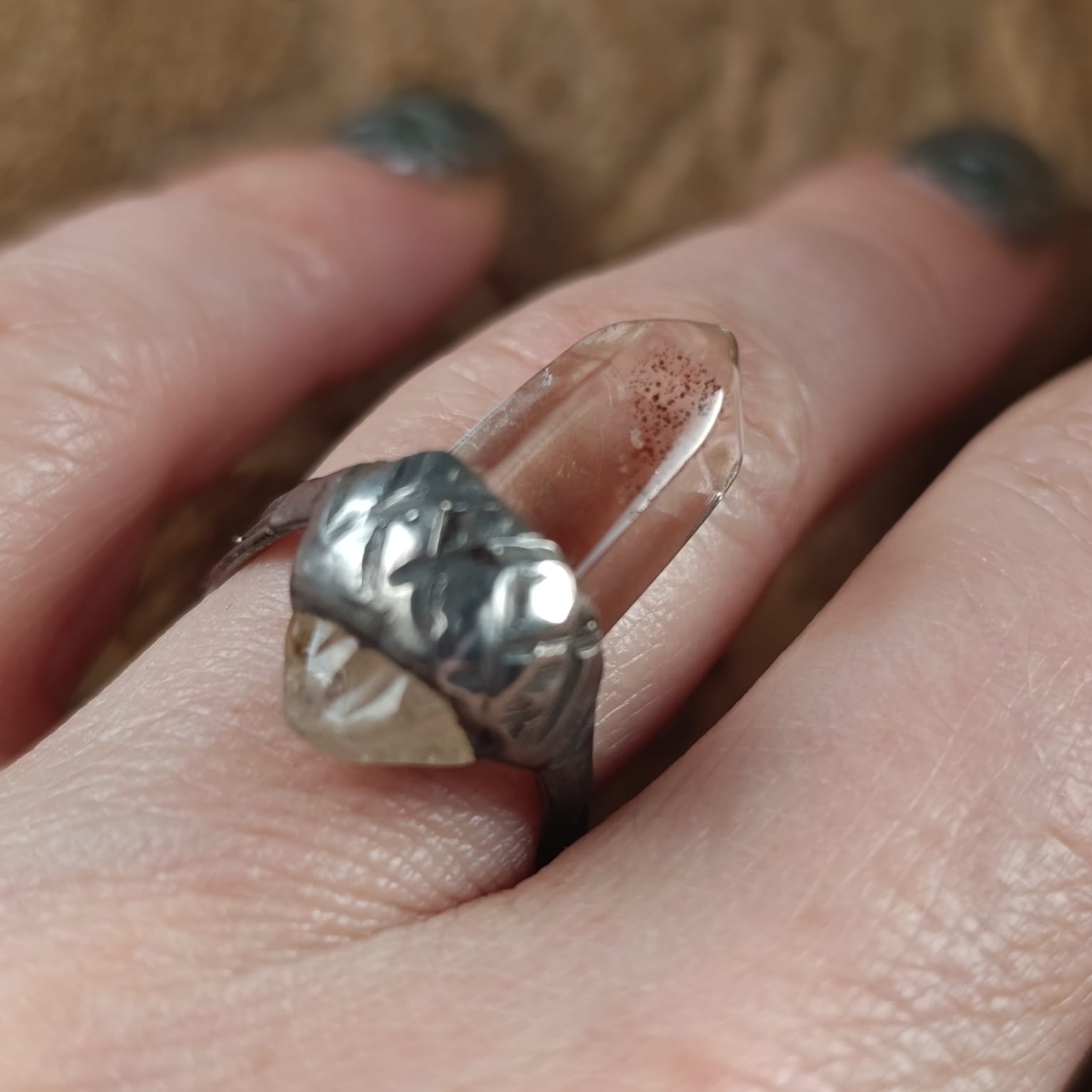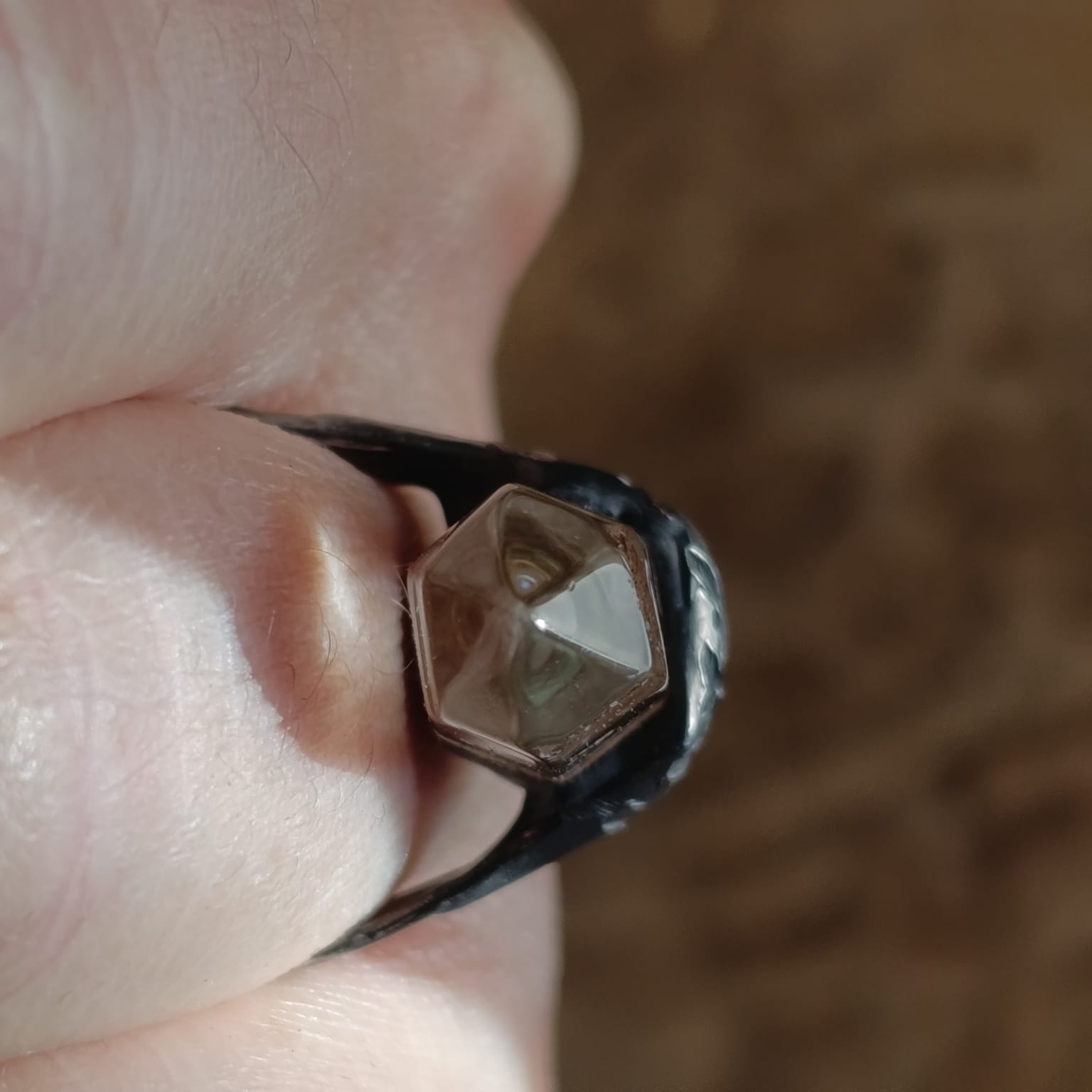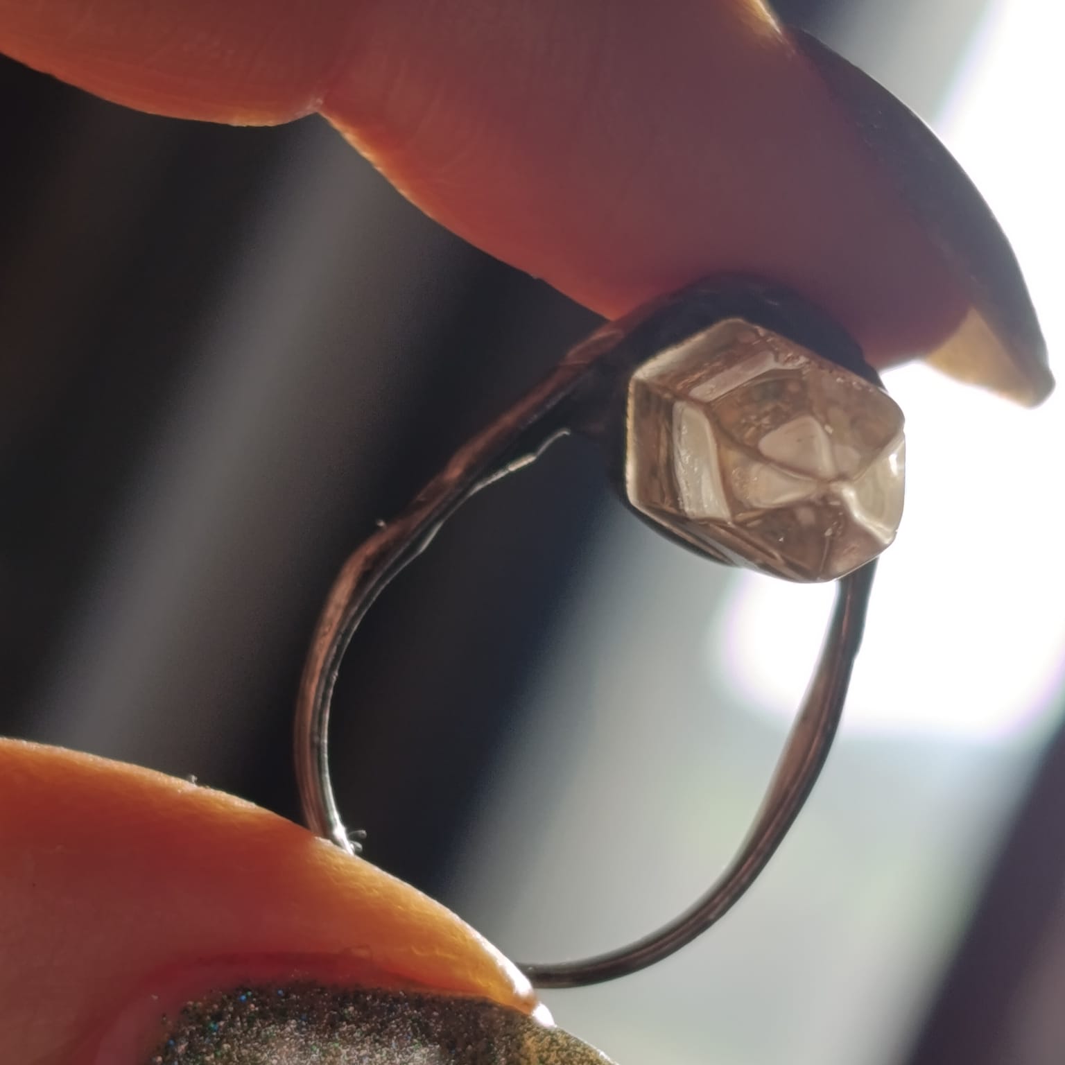 Žalud. Prsten s leštěným krystalem křišťálu. A ten křišťál obsahuje drobné železité inkluze. Proto by se skoro dal nazvat i lodolitem. Každopádně je to prsten pro osobu s citem pro detail, o kterém ví jen ona sama 💚